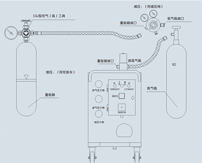 La herramienta de carga de nitrógeno del acumulador de la serie CQJ es una herramienta especial indispensable para que el acumulador infle, reponga el aire, corrija la presión de aire y verifique la presión de inflado. Tiene las características de estructura compacta, seguridad y confiabilidad, soporte de alta presión, resistencia al impacto y uso conveniente.