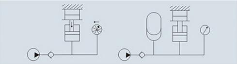 El acumulador generalmente separaba los dos medios (propósito hidráulico: nitrógeno y aceite). Sin embargo, el acumulador también se puede usar para transmitir presión entre dos líquidos que se pueden mezclar.